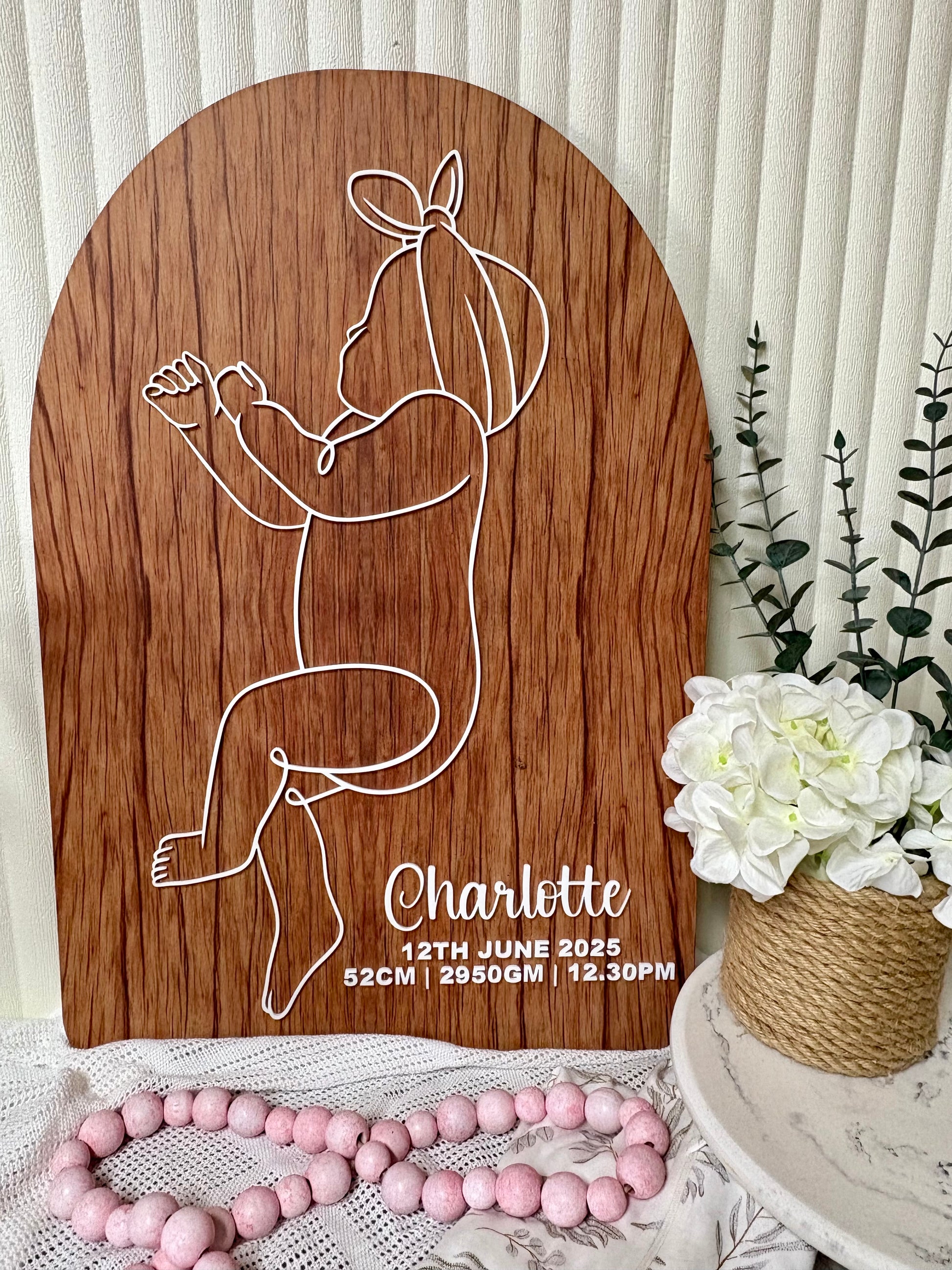 Celebrate your little one’s grand entrance with our 1:1 Scale Baby Arch! This charming plaque captures your baby’s true size at birth, complete with their special details. Crafted from printed MDF and acrylic, it’s perfect for brightening up the nursery. Easily hang it with 3M command strips or display it on a stand. A playful keepsake that grows more precious as your baby grows!