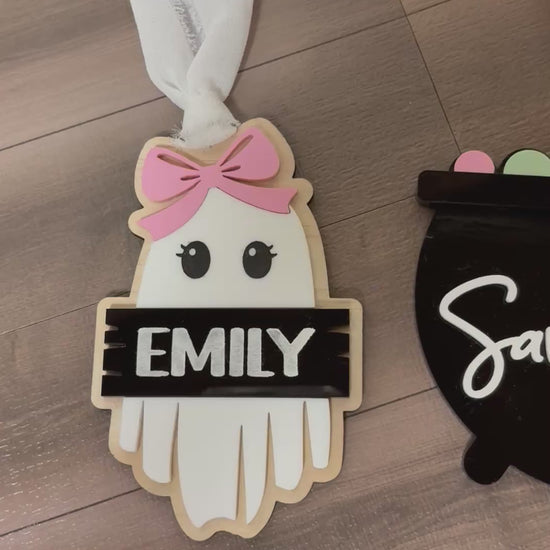 Create a fun and personalized Halloween basket with the addition of our adorable Boo Basket Tag! Featuring a charming ghost holding a name board, add your little ones name to make this tag special. Perfect for trick-or-treat buckets and bags, this layered design is made from plywood and acrylic . Such a delightful way to add a spooky, personal touch to your Halloween celebrations.